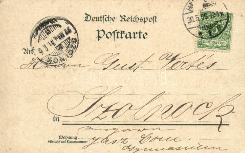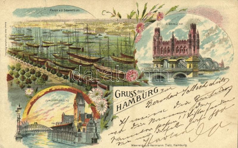 Beschreibung: 1899 Hamburg, Hafen v. d. Seewarteges., Elbbrücke, Jungfernbrücke. Kunst. Anst. Carl Leykum, Waarenhaus Hermann Tietz Art Nouveau, floral, litho (EK)