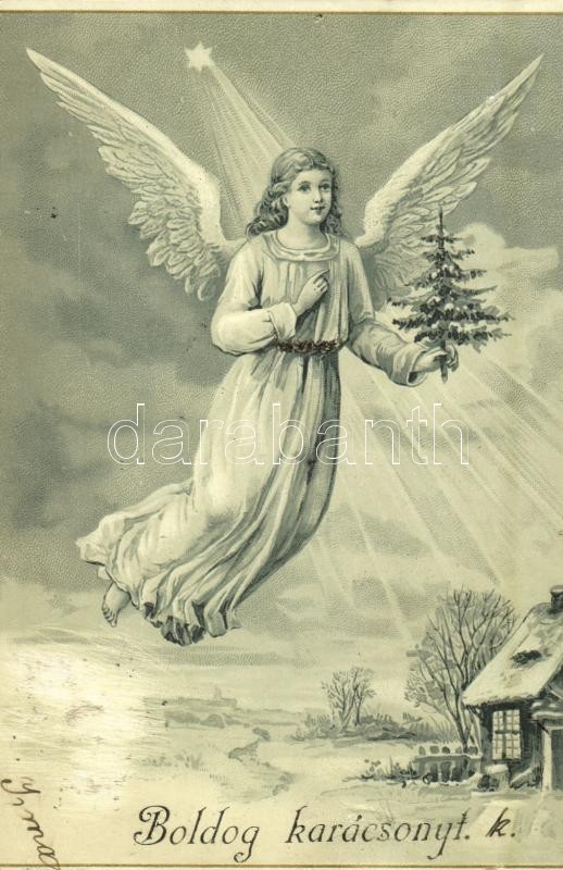 1901 "Boldog karácsonyt", üdvözlőlap / angel with Christmas ... https://www.darabanth.com/de/359-Fernauktion/359.0/Ansichtskarten/GruC39Fkarten-Feste~1000110/1901-Boldog-karacsonyt-udvozlolap-angel-with-Christmas-tree-star-winter-Christmas-greeti~II2067054