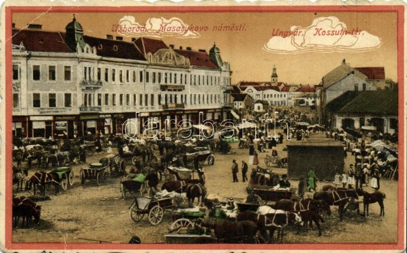 Ungvár, Uzshorod, Uzhhorod, Uzhorod; Masarykovo námesti / Kossuth tér, piaci árusok, üzletek, bor- és sörcsarnok, kocsma. Kiadja Székely és Illés / square, market vendors, shops, beer hall, inn (EK)