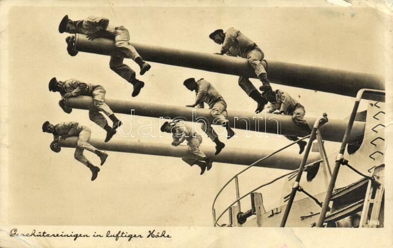 1942 Geschützreinigen in luftiger Höhe / WWII Wehrmacht (armed forces of Nazi Germany), Kriegsmarine (German Navy) mariners cleaning the cannons of a battleship + "Marine-Lazarett Bedburg-Hau Briefstempel" (EB)