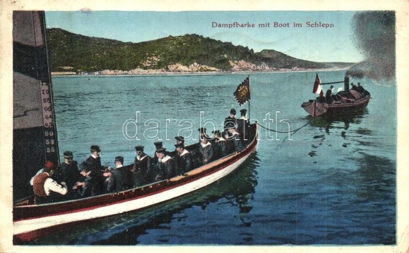 Beschreibung: Dampfbarke mit Boot im Schlepp. G. C. Pola / K.u.K. Kriegsmarine, steamship towing a boat with mariners