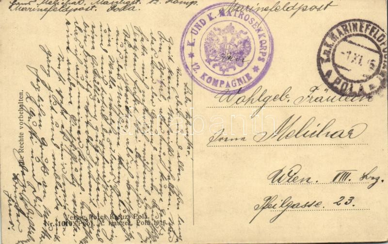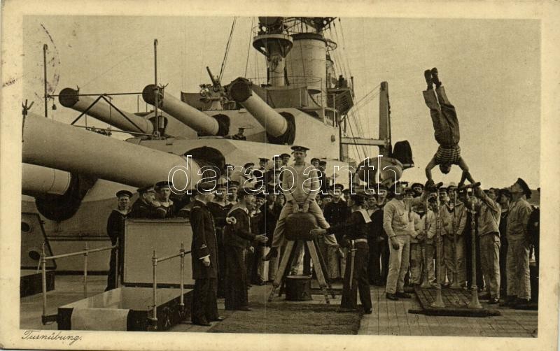 Beschreibung: SMS Tegetthoff az Osztrák-Magyar Haditengerészet Tegetthoff-osztályú csatahajója, tornagyakorlatokat végző matrózok a fedélzeten / Turnübung K.u.K. Kriegsmarine / WWI Austro-Hungarian Navy Tegetthoff-class battleship, mariners doing gymnastic exercises on board + "K.U.K. MATROSENKORPS 12. KOMPAGNIE" (r)
