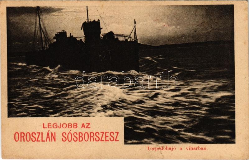 Torpedóhajó a viharban. "Oroszlán" sósborszesz reklám / SM Torpedoboot 62 T (ex Drache) / WWI Austro-Hungarian Navy K.u.K. Kriegsmarine 62T Kaiman-class torpedo boat with advertisement