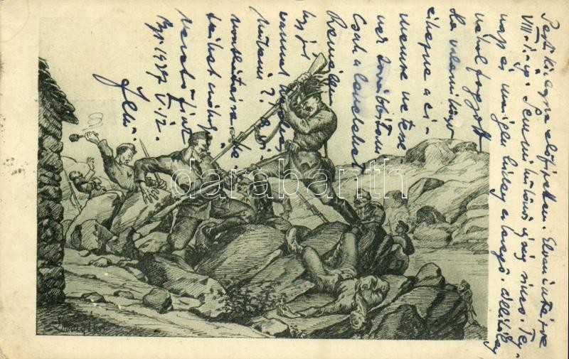 Beschreibung: Bekes Dániel csendőr 1915. évben az alsó Kazán-szorosban a Dunán átkelve megsemmisít egy szerb őrséget / WWI Hungarian gendarm in a battle (EK)