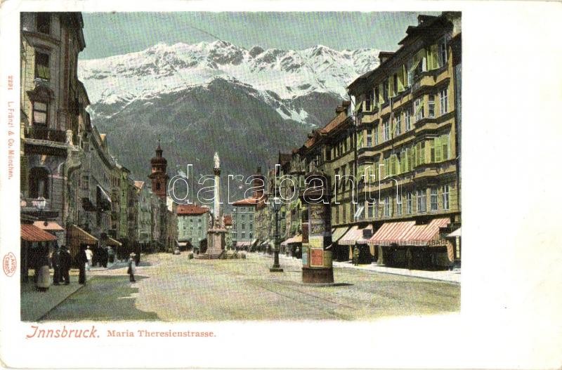 Beschreibung: Innsbruck, Maria Theresienstrasse. L. Fränzl & Co. 2291. / street view, shops, statue (EK)
