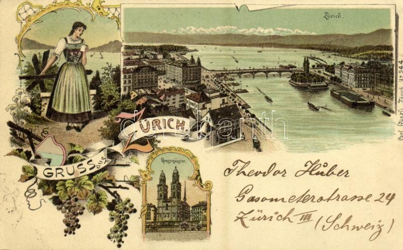 Beschreibung: 1898 Zürich, Grossmünster, Panorama / general view, cathedral, folklore, bridge, tram. Carl Künzli No. 244. Art Nouveau, floral, litho (EK)
