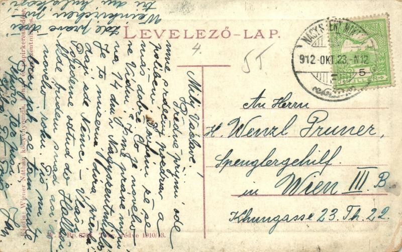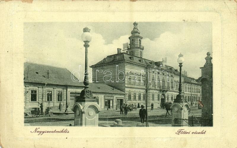 1912 Nagyszentmiklós, Sannicolau Mare; Fő tér, Városháza, üzletek. W. L. Bp. 6703. Kiadja Wiener Náthán könyvnyomdája / main square, town hall, shops (kopott sarkak / worn corners)
