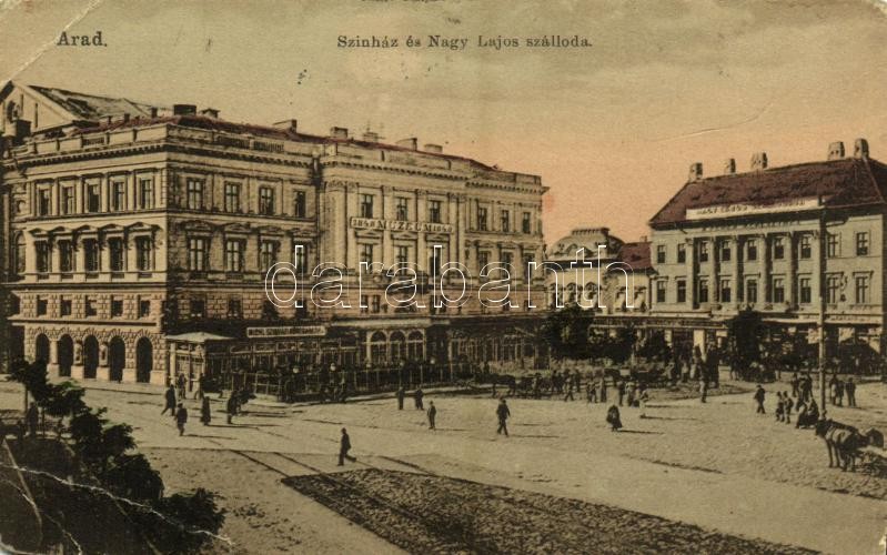 1917 Arad, Színház és Nagy Lajos szálloda, 1848-1849 Múzeum, Michl színházi sörcsarnok, Ifj. Klein Mór üzlete. Kiadja Keppich Zsigmond / theatre, hotel, relic museum, beer hall, shops (EB)