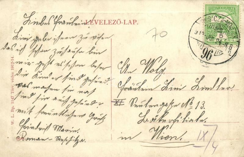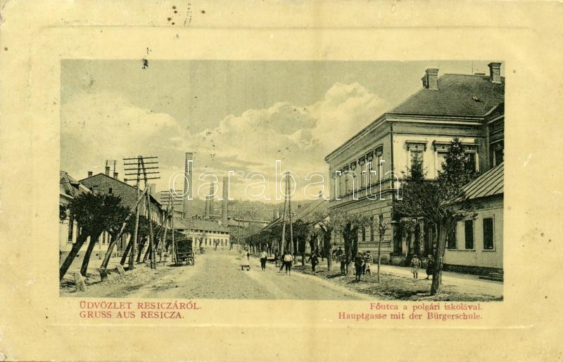 Resicabánya, Resicza, Recita, Resita; Fő utca a polgári iskolával, háttérben vasgyár. W. L. Bp. 1147. / Hauptgasse mit der Bürgerschule / main street, school, iron works + "RESICZA - VOJTEK 96" vasúti mozgóposta bélyegző (EK)