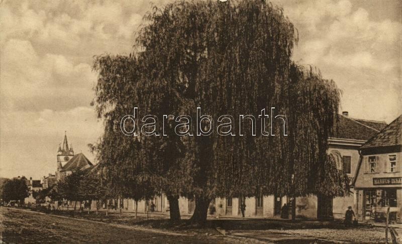 Szászsebes, Mühlbach, Sebesul Sasesc, Sebes; Siculorumgasse / Székely utca, Evangélikus templom, Markus Israel üzlete. Kiadja Josef Baumann. R. Renk felvétele / street view, Lutheran church, shop (EK)