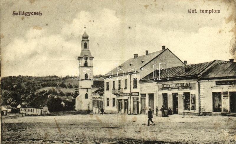 Beschreibung: Szilágycseh, Bömischdorf, Cehu Silvaniei; Református templom, Lebovits Jenő, Lebovits Herman üzlete / Calvinist church, shops (kis szakadások / small tears)