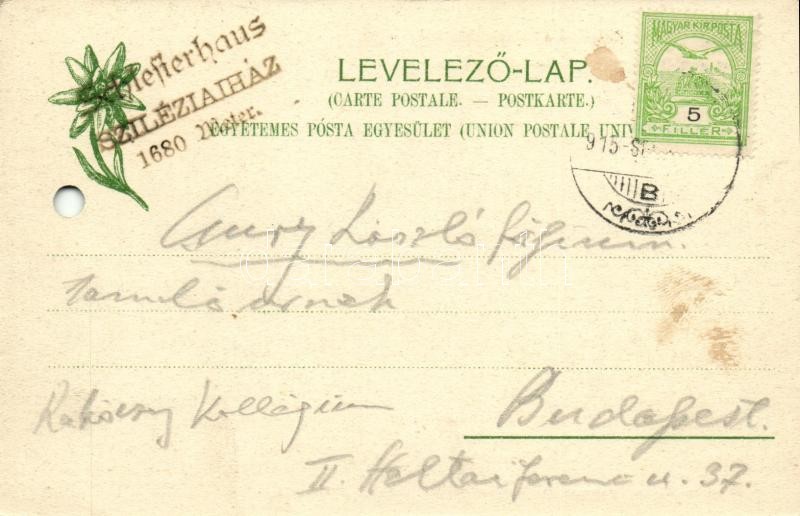 1915 Tátra, Magas Tátra, Vysoké Tatry; Felkai tó a sziléziai ház felé. Kiadja Feitzinger Ede 766. 1904-14. / Felkauer See gegen das Schlesierhaus / Velické pleso, Sliezsky dom / lake, chalet (lyukasztott / punched hole)