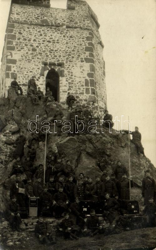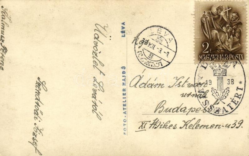 1938 Léva, Levice; bevonulás, katonák a lévai várnál / Levicky hrad / entry of the Hungarian troops, soldiers by the castle. Foto-Atelier Hajdú photo + "1938 Léva visszatért" So. Stpl.