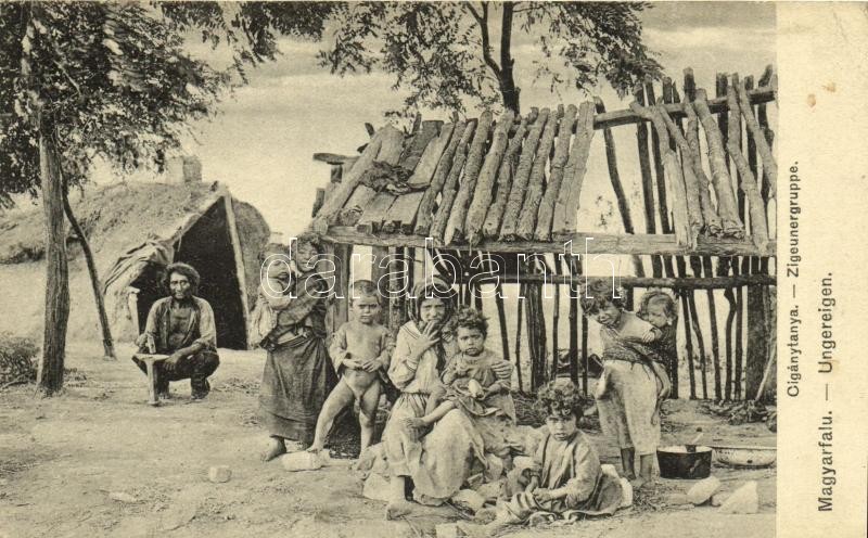 Magyarfalu, Magyarfalva, Ungeraiden, Ungereigen, Uhorská Ves, Záhorská Ves; Zigeunergruppe / Cigány tanya, cigány család a kunyhójuknál. Wiesner A. 35 b. / Gypsy folklore, gypsy camp, gypsy family by their hut (EK)