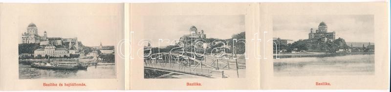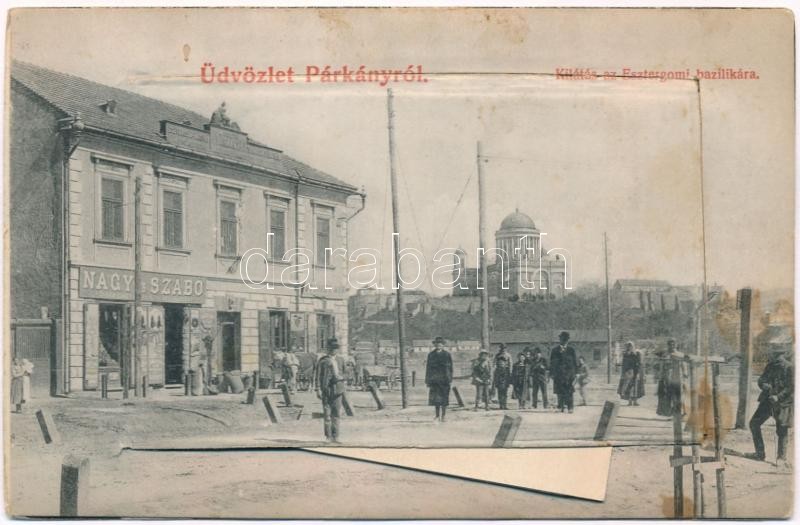 Párkány, Stúrovo; Kilátás az esztergomi bazilikára, Nagy és Szabó üzlete, sérült leporellólap (levált tartalom), rajta vasútállomás, hajóállomás, takarékpénztár, stb. / view to the Basilica in Esztergom, shop, damaged leporellocard (detached) with railway station, ship station, savings bank, etc. inside