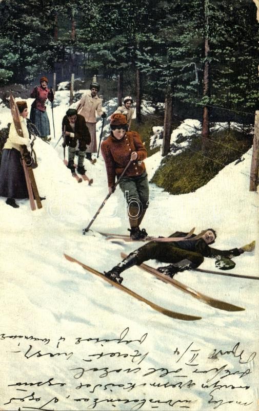 Winter sport, Lady skiing over a fallen man (wet corner) https://www.darabanth.com/de/359-Fernauktion/359.0/Ansichtskarten/Sport~1000104/Winter-sport-Lady-skiing-over-a-fallen-man-wet-corner~II2067350