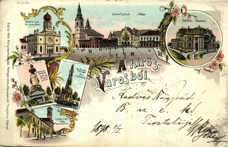 1898 (Vorläufer!) Kecskemét, Fő tér, színház, zsinagóga, Katona József és Szentháromság szobor, Katolikus főgimnázium. Gallia-féle könyvkereskedés Metzger Béla kiadása, Art Nouveau, floral, litho (EK)