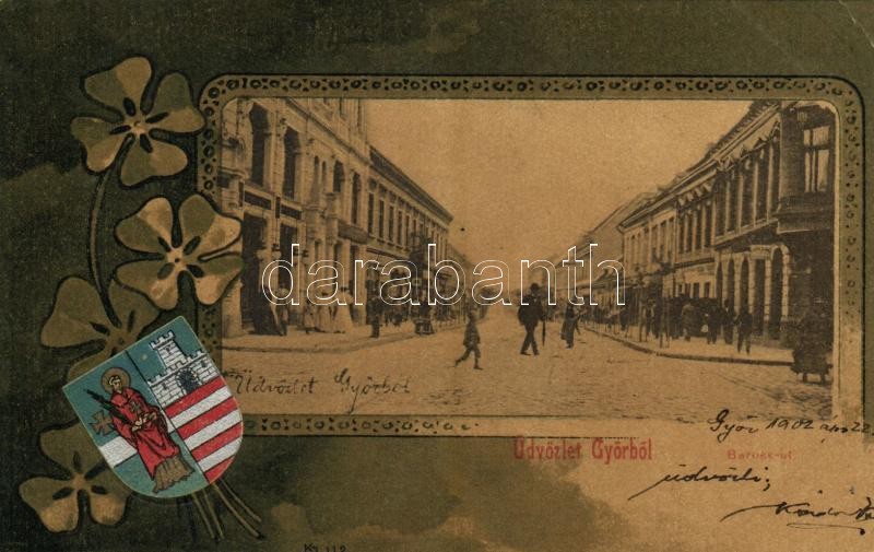 1902 Győr, Baross út, üzletek. Kiadja Rőszler Károly. Címeres szecessz... https://www.darabanth.com/de/359-Fernauktion/359.0/Ansichtskarten/Ungarn~1000004/1902-Gyor-Baross-ut-uzletek-Kiadja-Roszler-Karoly-Cimeres-szecesszios-litho-keret-EK~II2064962