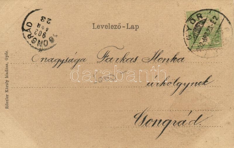 Beschreibung: 1902 Győr, Baross út, üzletek. Kiadja Rőszler Károly. Címeres szecessziós litho keret (EK)