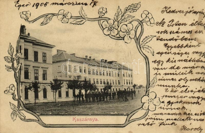 1905 Eger, Kaszárnya. Art Nouveau, floral (Rb) https://www.darabanth.com/de/359-Fernauktion/359.0/Ansichtskarten/Ungarn~1000004/1905-Eger-Kaszarnya-Art-Nouveau-floral-Rb~II2067596