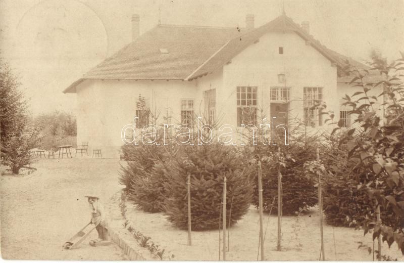 1914 Pusztaszer, villa, kerti törpe talicskával. photo https://www.darabanth.com/de/359-Fernauktion/359.0/Ansichtskarten/Ungarn~1000004/1914-Pusztaszer-villa-kerti-torpe-talicskaval-photo~II1887750