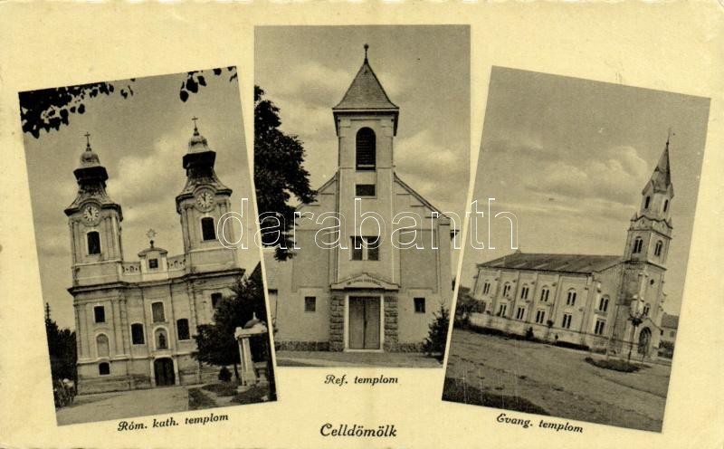 1942 Celldömölk, Római katolikus, református és evangélikus templom https://www.darabanth.com/de/359-Fernauktion/359.0/Ansichtskarten/Ungarn~1000004/1942-Celldomolk-Romai-katolikus-reformatus-es-evangelikus-templom~II2064164