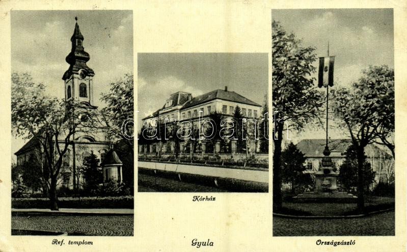 1942 Gyula, kórház, református templom, országzászló (EK) https://www.darabanth.com/de/359-Fernauktion/359.0/Ansichtskarten/Ungarn~1000004/1942-Gyula-korhaz-reformatus-templom-orszagzaszlo-EK~II2065701