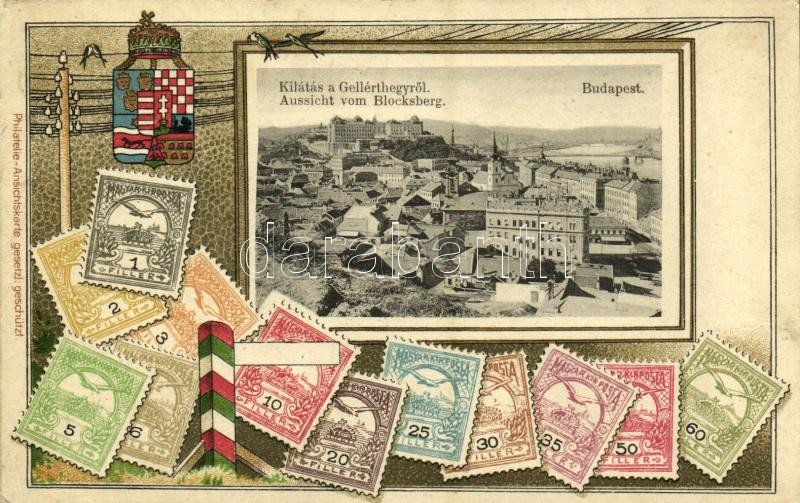 Beschreibung: Budapest I. Kilátás a Gellérthegyről. Címeres és magyar bélyeges díszes képeslap. Philatelie-Ansichtskarte litho (ázott sarok / wet corner)