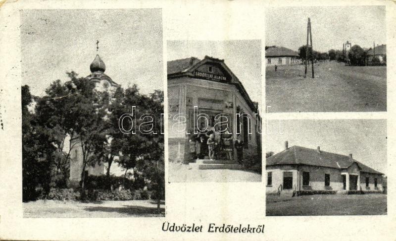 Beschreibung: Erdőtelek, Római katolikus templom, Fő utca, Erdőtelki Hangya Szövetkezet üzlete és vendéglője és saját kiadása (Rb)
