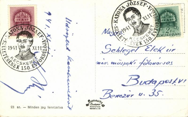 Beschreibung: Kecskemét, látkép, zsinagóga, református gimnázium, Fuchs Samu üzlete + "1941. XI. 11. Katona József születésének 150. évfordulója Kecskemét" So. Stpl. (EK)