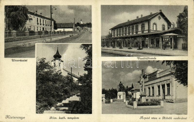 Beschreibung: Kisterenye (Bátonyterenye), Római katolikus templom, Árpád utca, Hősök szobra, emlékmű, Vasútállomás, utca (EK)