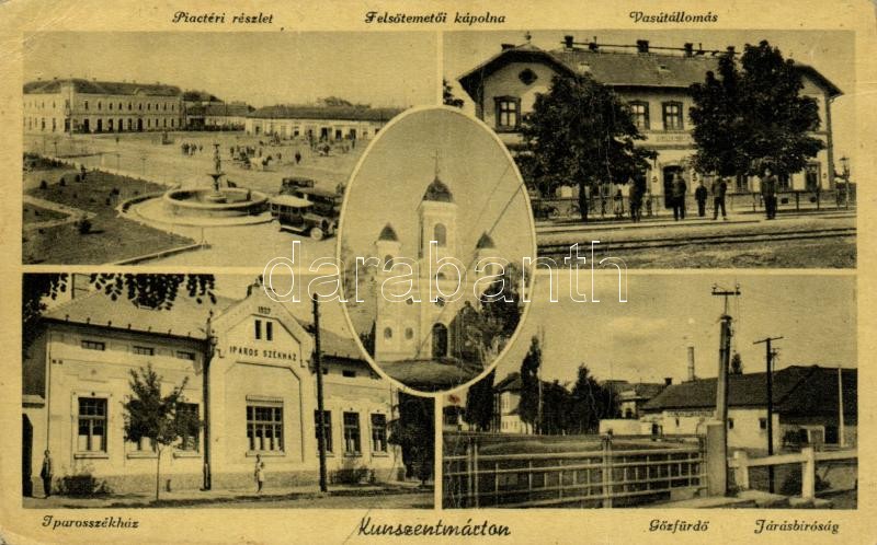 Beschreibung: Kunszentmárton, Piac tér, automobil, Vasútállomás, vasutasok, Iparos székház, Gőzfürdő, Járásbíróság, Felsőtemetői kápolna. Kiadja Turek Sándorné. Benke felvételei (fa)