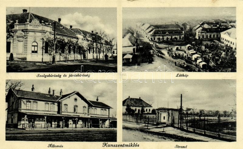 Beschreibung: Kunszentmiklós, Szolgabíróság és járásbíróság, látkép, Vasútállomás, Strand. Kiadja E. Gyene Gusztáv