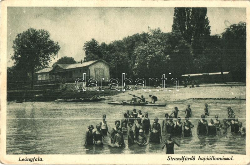 Leányfalu, Strandfürdő, fürdőzők, hajóállomás, evezősök, sport (fa) https://www.darabanth.com/de/359-Fernauktion/359.0/Ansichtskarten/Ungarn~1000004/Leanyfalu-Strandfurdo-furdozok-hajoallomas-evezosok-sport-fa~II1904225
