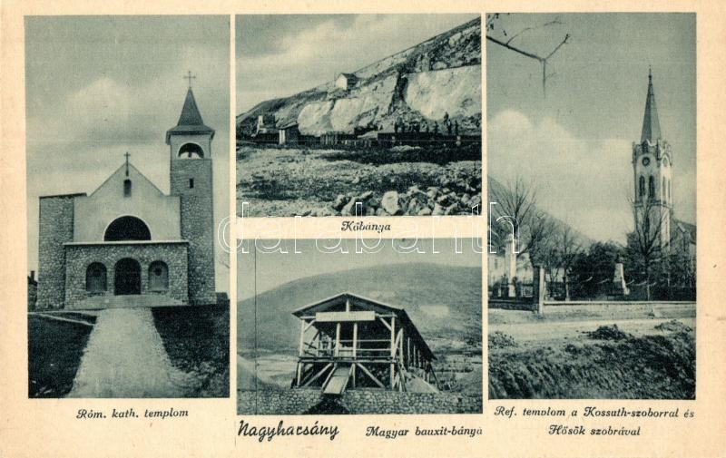 Beschreibung: Nagyharsány, Római katolikus templom, Kőbánya, Magyar bauxit bánya, Református templom a Kossuth szoborral és Hősök szobrával