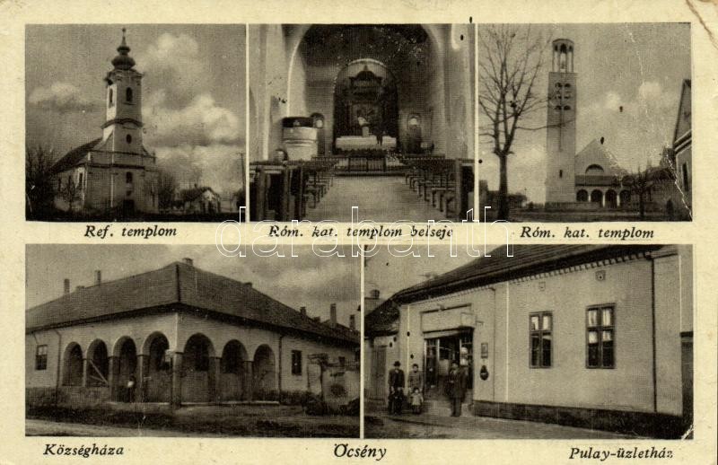 Beschreibung: Őcsény, Római katolikus templom, belső, Református templom, Községháza, Pulay György üzlete és saját kiadása (EK)