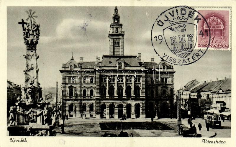 Beschreibung: Újvidék, Novi Sad; Városháza, Szentháromság szobor, villamos / town hall, Trinity statue, tram + "1941 Újvidék visszatért" So. Stpl