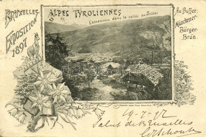 1897 Bruxelles Exposition, Alpes Tyroliennes, L'ascension dans la vallée du Ziller, Au Buffet Münchener Bürger-Brau / Tyrolean Alps, Ziller Valley, Brussels International Exposition advertisement, Art Nouveau, floral