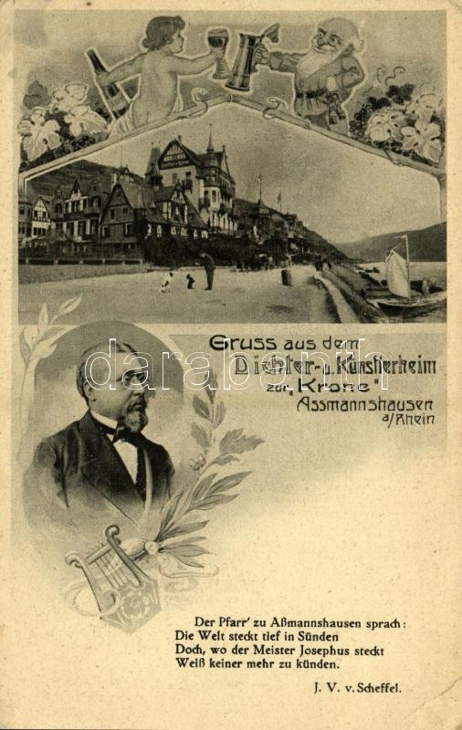 Beschreibung: Dichter- u. Künstlerheim zur "Krone" Assmanshausen (Rüdesheim am Rhein), Joseph Victor von Scheffel / hotel and inn, poet, advertisement, Art Nouveau (EK)