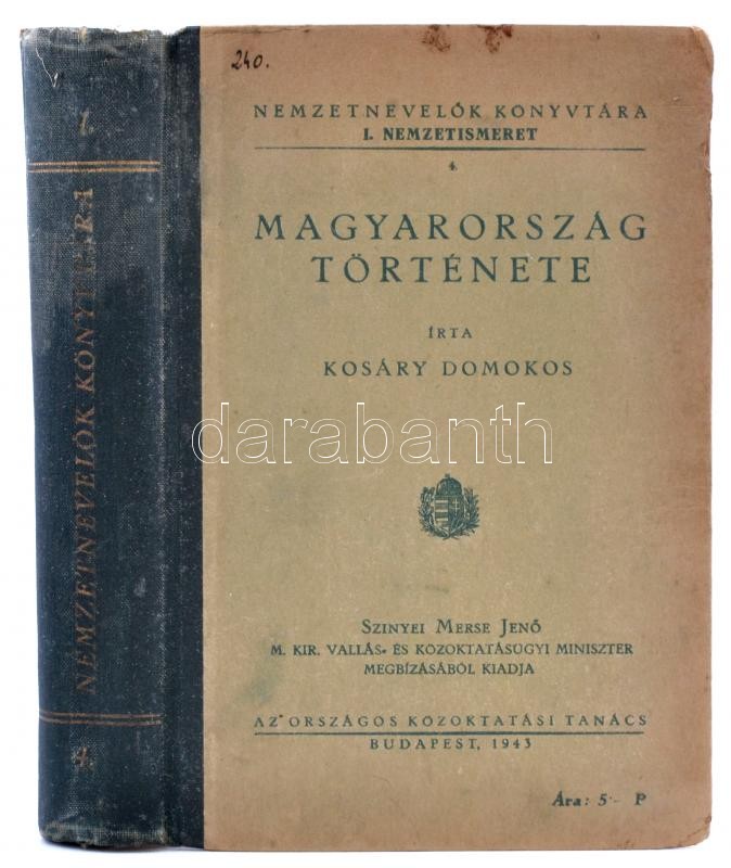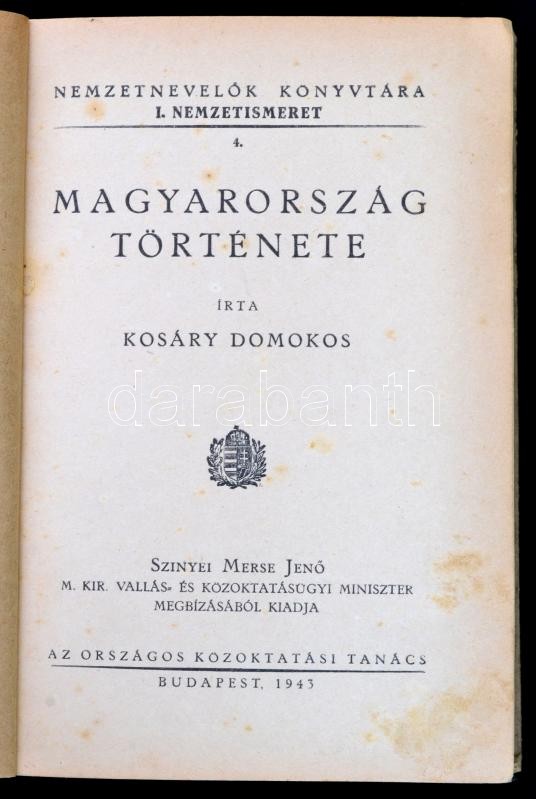 Kosáry Domokos: Magyarország története. Nemzetnevelők könyvtára I. Nemzetismeret 4. Bp.,1943, Országos Közoktatási Tanács. Térképekkel, fekete-fehér fotókkal illusztrált. Térképekkel, Kiadói félvászon-kötésben.