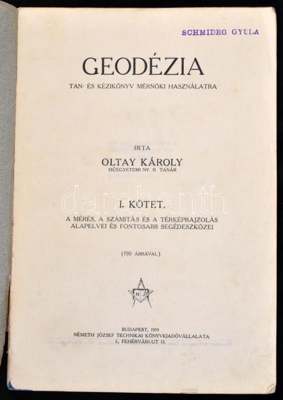 Oltay Károly: Geodézia. I. kötet: A mérés, a számítás és a térképrajzolás alapelvei és fontosabb segédeszközei. Tan- és kézikönyv mérnöki használatra. Bp.,1919, Német József, XI+262 p. Kiadói papírkötés, a gerincen hiánnyal, kissé sérült, kissé laza kötéssel.