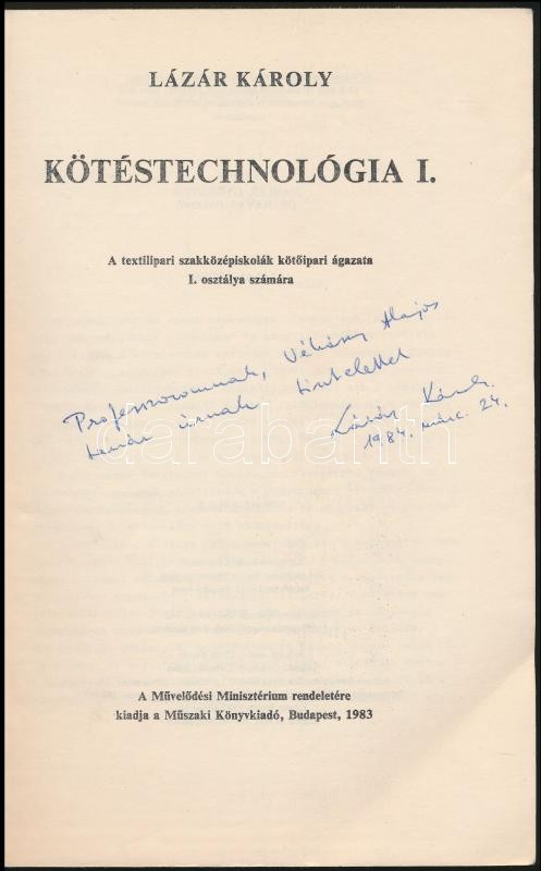 Lázár Károly: Kötéstechnológia I. kötet. Bp.,1983, Műszaki. Kiadói papírkötésben. Megjelent 1660 példányban.