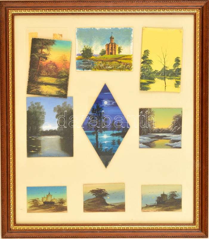 Beschreibung: Jelzés nélkül: Tájképek (9db). Vegyes technika, karton, 11×8 cm-5,5×8,5 cm, üvegezett keretben, 42×37 cm