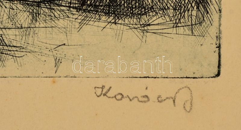 Beschreibung: Kovács Júlia (1924-2007): Szénahordás. Rézkarc, papír, jelzett, 21×29 cm