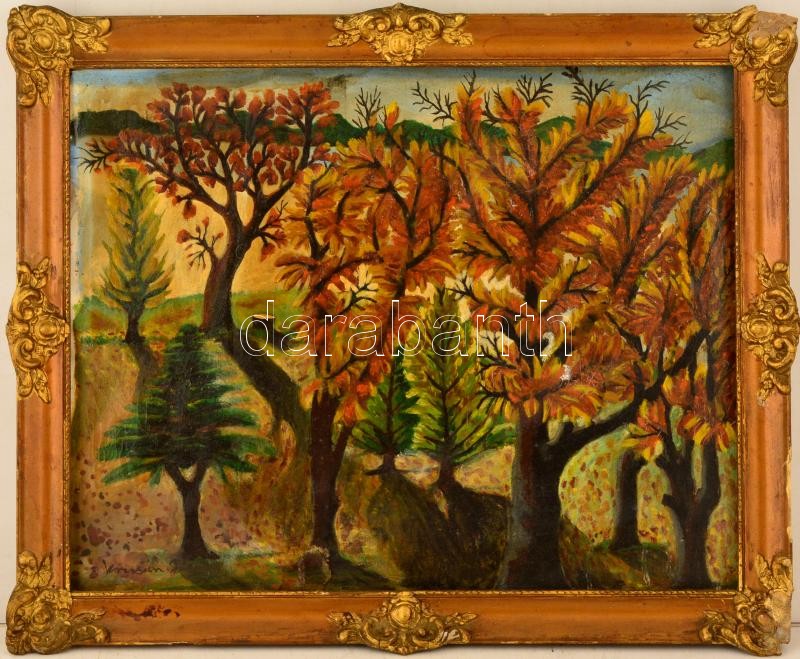 Beschreibung: Krizsán jelzéssel: Fák a tó partnál. Olaj, vászon, foltos, hibás keretben, 39×49 cm