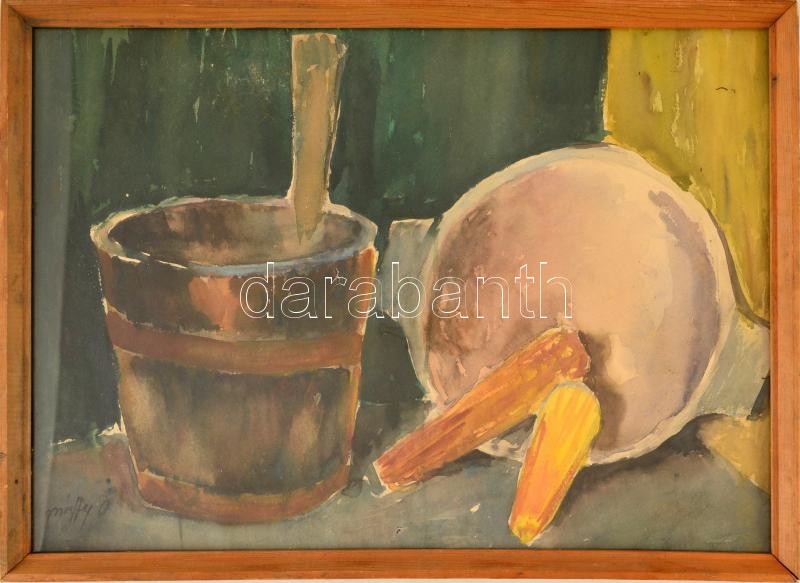 Beschreibung: Márffy jelzéssel: Csendélet. Akvarell, papír, üvegezett keretben, 36×52 cm
