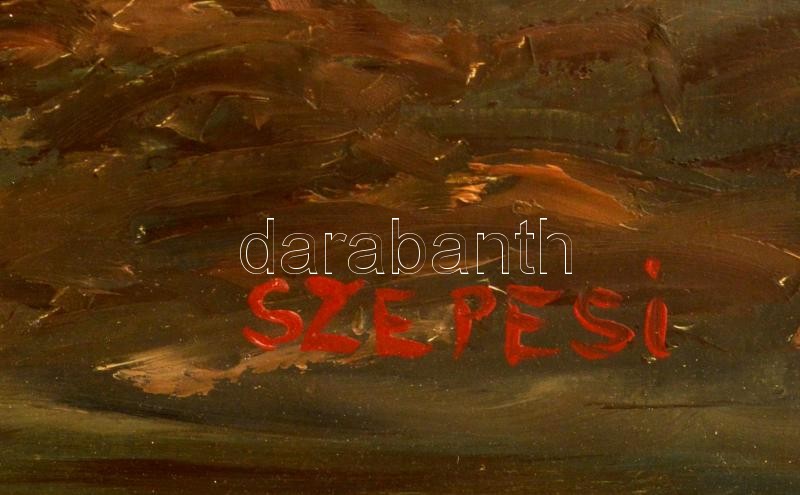Beschreibung: Szepesi Andor (1954-): Táj. Olaj, farost, jelzett, keretben, 40×80 cm