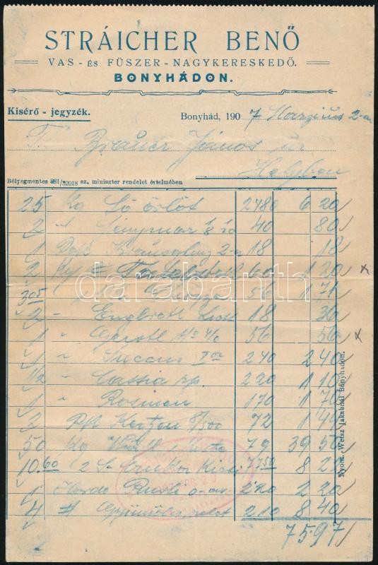 1907 Bonyhád, Stráicher Benő Vas- és Fűszer-Nagykereskedő fejléces szá... https://www.darabanth.com/de/359-Fernauktion/359.0/Kunst-Dokumente-andere-Sammelgebiete/Dokument~500018/1907-Bonyhad-Straicher-Beno-Vas-es-Fuszer-Nagykereskedo-fejleces-szamlaja~II2064902