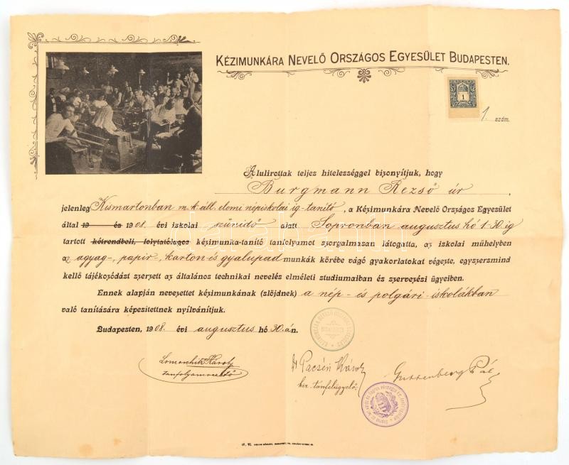 Beschreibung: 1908 Bp., A Kézimunkára Nevelő Országos Egyesület által kiállított oklevél tanfolyam elvégzéséről 1 korona okmánybélyeggel