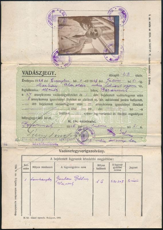 1925 Fényképes vadászjegy https://www.darabanth.com/de/359-Fernauktion/359.0/Kunst-Dokumente-andere-Sammelgebiete/Dokument~500018/1925-Fenykepes-vadaszjegy~II2066453